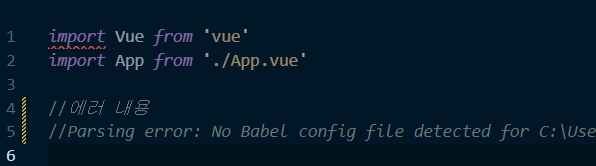 vue.js 공부 중 vue/cli 설치 후 js파일 코드에 아래와 같은 에러가 났다.
