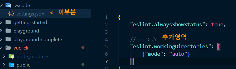 "eslint.workingDirectories": [{"mode": "auto"}]settings.json 파일은 .vscode 아래에 있음.